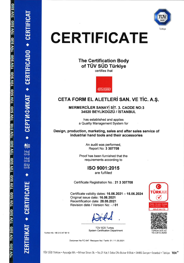 Ceta Form, Türkiye’nin lider el aletleri üreticisi olan 47 yıllık bir kuruluştur. İstanbul’daki modern fabrikamızda tüm sektörlerdeki profesyonel kullanıcılar için yüksek kaliteli el aletleri geliştirir ve üretiriz. Türkiye’deki geniş bayi ağımızın yanında, yaklaşık 45 ülkede distribütörlerimiz ve İngiltere’de kendimize ait satış ofisimiz bulunmaktadır.